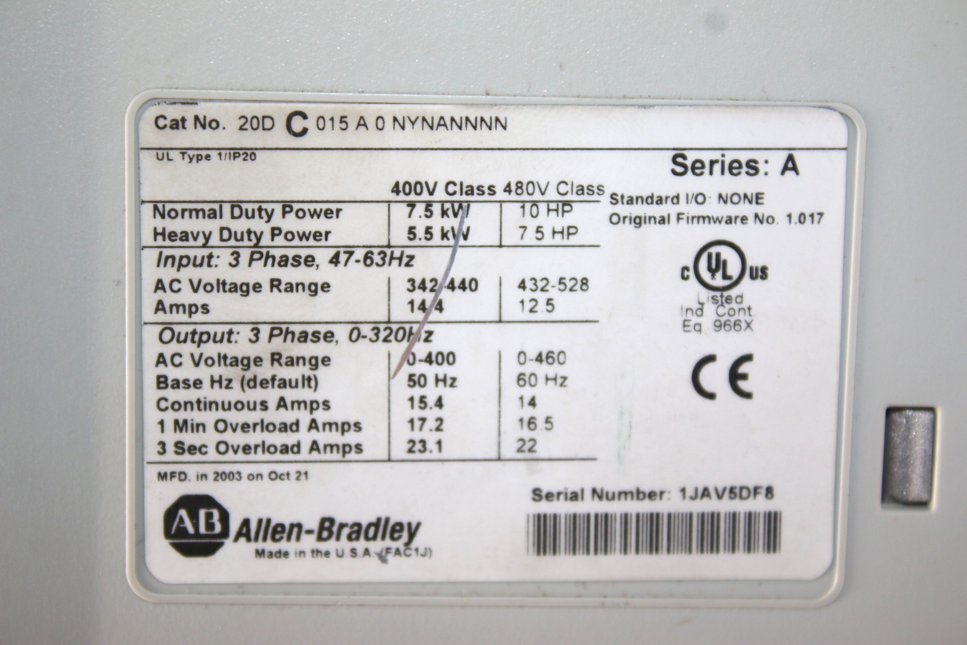 Manufacturer: ALLEN BRADLEYType: AC VARIABLE SPEED DRIVEModel: 20DC015A0NYNANNNNSeries/Family: PowerFlex 70